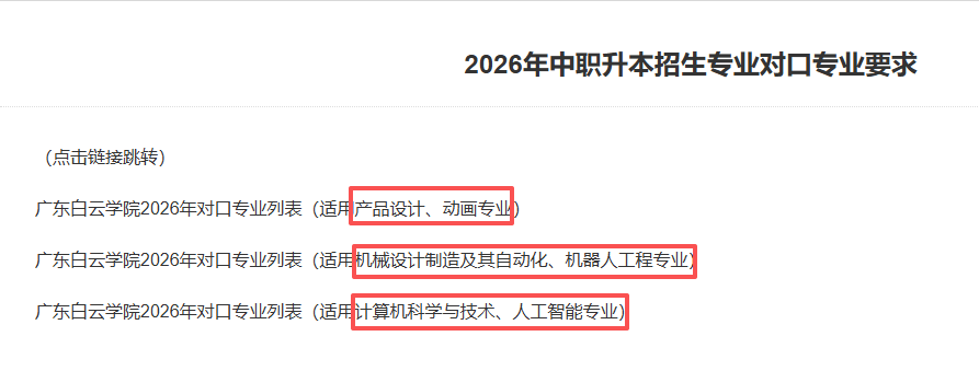 广东白云学院正在学校官网发布了2026年中职升本招生专业对口专业要求,共6个专业招生,动画、机械设想制制及其从动化、机械人工程、计较机科学取手艺、人工智能专业,本年没有新增专业。