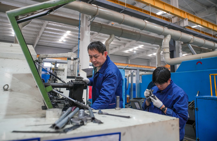 正在山东雷英精工科技无限公司出产车间,工人正通细致密设备将滑腻杆件压出细密螺纹。王建炜 摄。